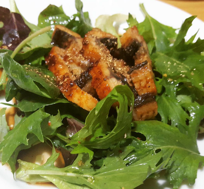 - 盛り付けたうなぎに、4のバジルソースをかけたら完成です。
