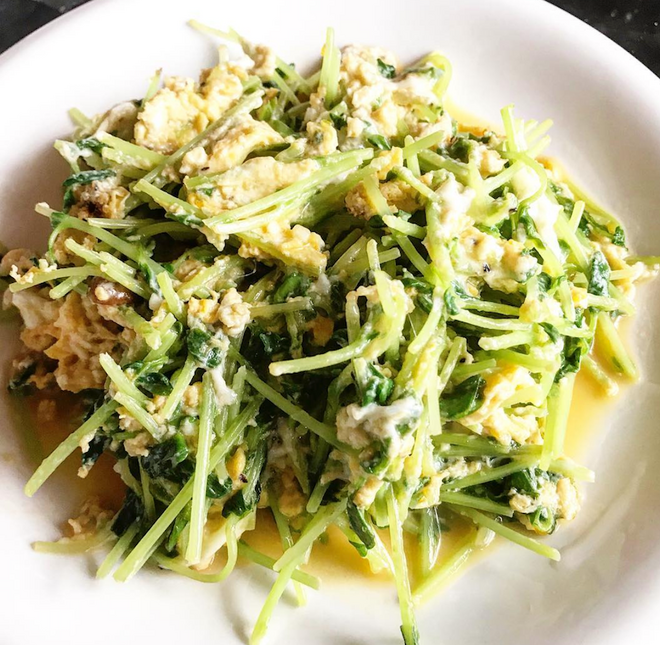 - 卵を溶いて全体に流し入れ、蓋をして火を止めましょう。豆苗に火が通りすぎないように素早く入れてください。