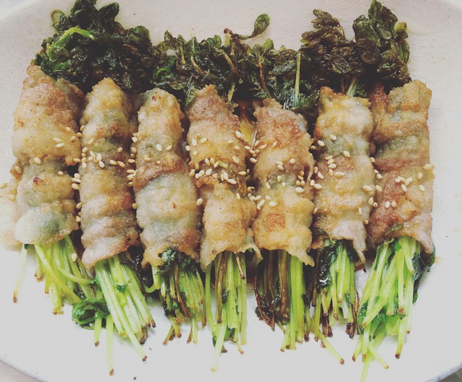 - しゃぶしゃぶ用の豚肉で豆苗を巻いていきましょう。豚肉の部位はお好みで用意し、あっさりが良ければもも肉、ジューシーに仕上げたければバラ肉を使ってください。