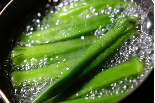 オクラは切ってから茹でるのはNG。水っぽくなります。ヘタを切り落とさず、ガクの部分を削ぐだけにしましょう。茹で時間はせいぜい2分程度です。