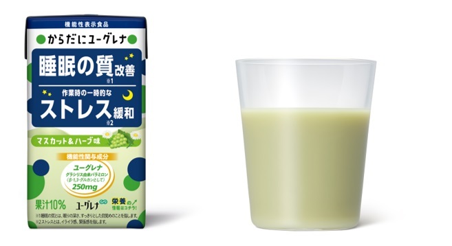 2023年9月に「からだにユーグレナ」シリーズから、独自素材「ユーグレナグラシリス由来パラミロン」と「植物性乳酸菌K-1」を配合した「睡眠の質改善」「起床時の疲労感軽減」「おなかの調子を整える」をサポートする機能性表示食品「からだにユーグレナ ピーチミックス風味 乳酸菌入り」を発売されました。