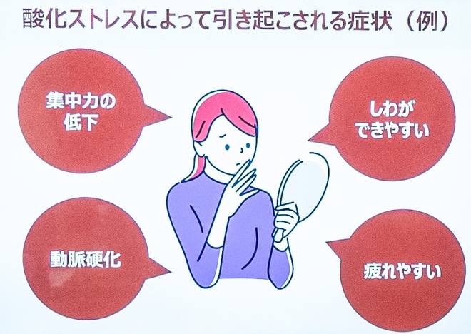この余った活性酸素が細胞にダメージを与え、老化に向かうことを酸化ストレスという。体に蓄積した活性酸素が、自身のカラダを傷つけてしまうのだ。
