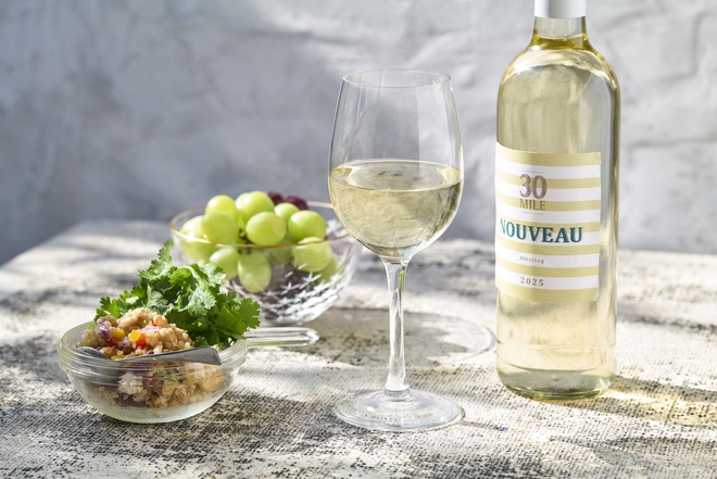 「30 マイルヌーヴォ リースリング」は、爽やかな白い花を思わせる香りと、レモンやライムのようなキリッとしたフレーバーが特長。シャープな酸が際立つ辛口の味わいは、キンキンに冷やして楽しむのがおすすめ。食前酒や前菜と合わせても、すっきりとした爽快感があります。