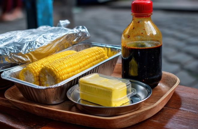 - 焼き上がりにバターと醤油をかけて仕上げる。