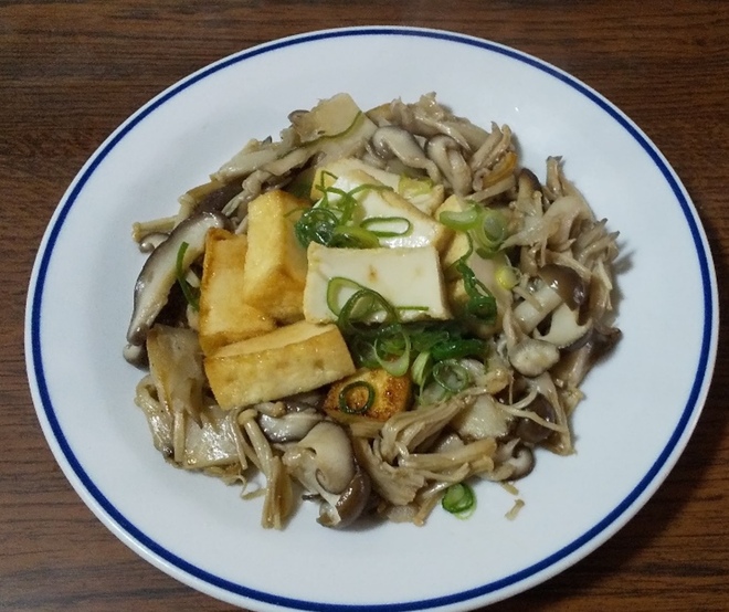 たんぱく質をプラスしたい場合は、厚揚げを、水で薄めためんつゆで炒めてきのこの塩麹炒めの上に載せます。
