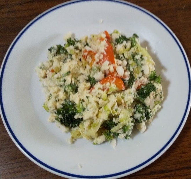 さらに、たんぱく質をプラスしたい場合はフライパンにおから50gを入れて、炒めます。野菜の塩麹炒めにおからを入れて、マヨネーズ50gを混ぜたら完成です。