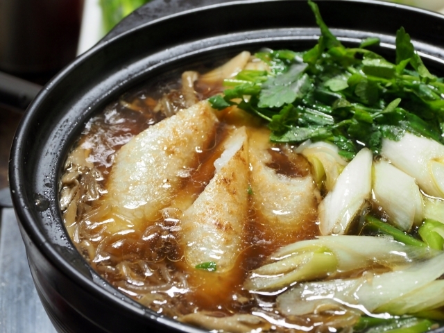 潰したうるち米を、棒に包むように巻き付けて焼いたきりたんぽを使った鍋です。きりたんぽは棒から外して食べやすく切り、比内地鶏の出汁や醤油をベースとしたスープで、比内地鶏、きりたんぽ、ねぎなどの具材を入れて煮込んだ後、仕上げにセリを入れるのが特徴です。
