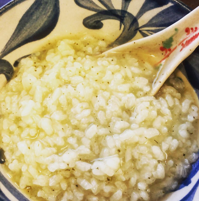 - ごはん、粉末緑茶を加え弱火でゆっくり煮ます。