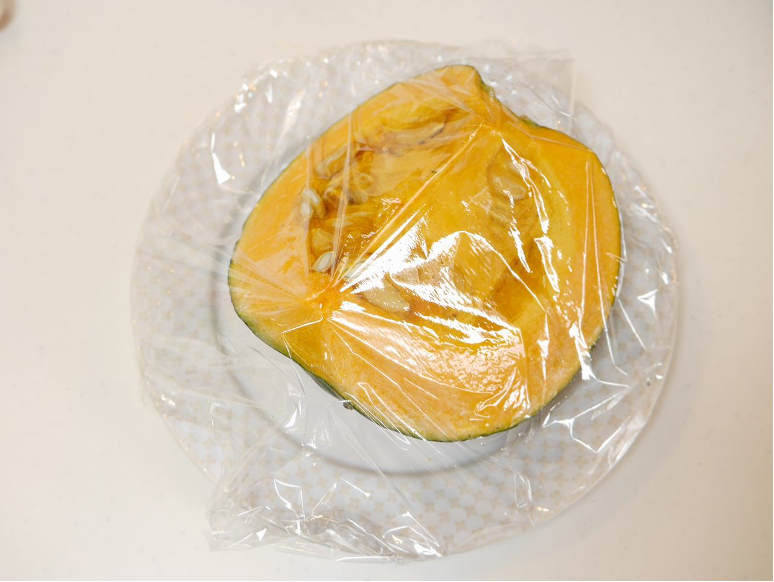 - かぼちゃを洗った後ラップをし、電子レンジで加熱する(600W約5分)