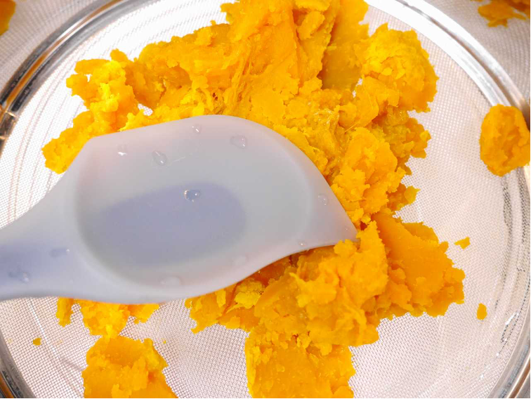 - 完全に火が通ったら種を取り除き、スプーンでかぼちゃの身を取り出したら裏ごしをする。