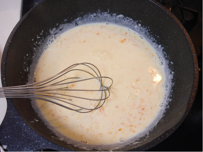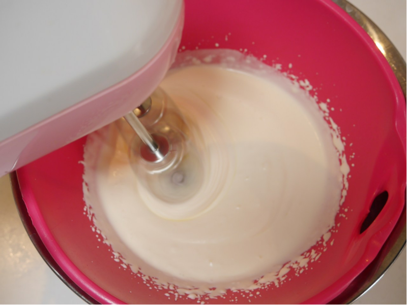 - 2に生クリーム・砂糖を加え泡立て器でよくまぜる。