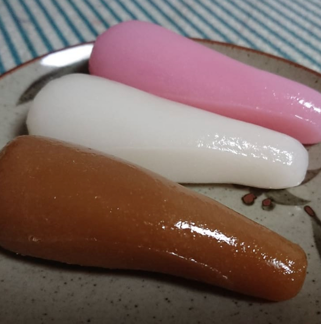 細長い「しずく型」で色は白・茶・ピンクの3色の団子です。こちらも里芋をイメージした形だと言われています。