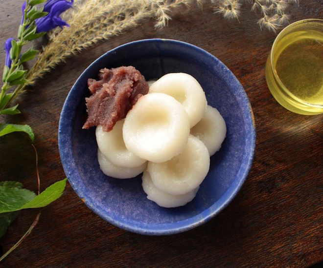 通称“へそもち”と言われ、団子の真ん中をくぼませ、そこにあんこを添えて食べます。