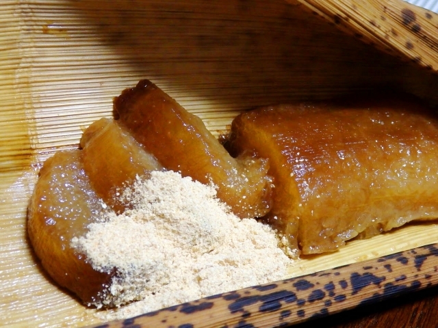 麦だんごは徳島県の脇町で食べられている郷土料理です。麦だんごには大麦の粉を使い、薄い茶色の素朴なお団子で、山帰来(さんきらい)の葉で包んでいます。この地方でも元々、端午の節句は月遅れの6月に行われていたため、ちょうど麦の収穫時期であることから、麦だんごを食べていたと言われています。