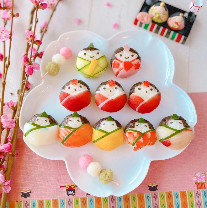 これだけひな祭りのパーティーが盛り上がりそうな節句ご飯。キュウリやハム、カニかまなど、冷蔵庫にいつもあるような材料で作れるのがいいですよね。