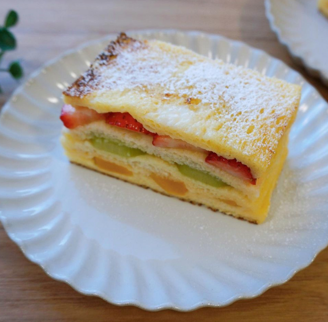 - ボウルに卵を割りほぐし、砂糖と牛乳を加え混ぜ合わせる。バットに流し入れ、サンドイッチ用のパンを浸す。