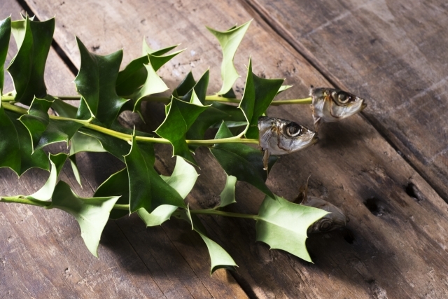 焼いた鰯の頭を柊に指して玄関先に飾ります。柊の棘が鬼の目に刺さるため家に入ってこられない、鰯の臭いで鬼を寄せ付けないといった意味合いで飾られています。