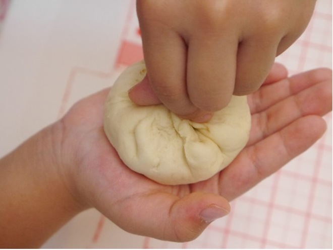 - 1の生地を手のひらで丸くのばし、真ん中にさつまいも餡をのせる。