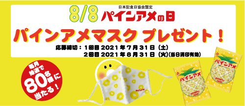 なんと、7月から8月の2ヶ月に渡り、パインアメをデザインしたマスクがそれぞれ毎月80名様にもらえちゃうのです。