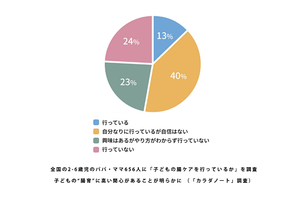 AuBが業務提携している、妊婦や育児向けアプリ提供のカラダノートのメルマガ会員656人(全国の2〜6歳児のパパ・ママ)を対象としたアンケート調査によると、子どもの腸ケアに対して約76%が「興味を持っている」と回答したものの、全体の40%が「子どもの腸ケアに自信がない」と回答。