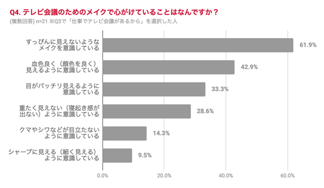 テレビ会議のためにメイクをしている人に「テレビ会議のためのメイクで心がけていること」を聞いたところ、「すっぴんに見えないようなメイクを意識している(61.9%)」人がもっとも多かった。最低限のマナーのためにも、身だしなみを維持している感じだろうか。打ち合わせも対面ではなくなり、人のコミュニケーションが少なくなると、そこまでメイクや服装に意識をしないでも生活はしていけてしまう。自分の気分のためにも、モチベーション維持のためにも、ある程度はメイクも服装も品を保ちたいところだ。