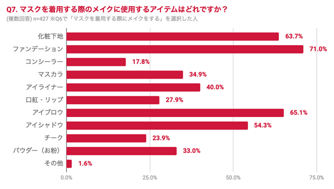 マスク着用時に使用するメイクアイテムは、「ファンデーション」「アイブロウ」「化粧下地」が多くなっている。「コンシーラー」「チーク」「口紅・リップ」などの使用は減っていることがわかる。基本的なシンプルなメイクになっていることが伺える。