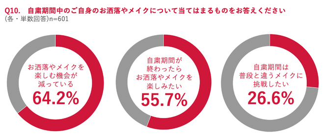 また自粛中について「お洒落やメイクを楽しむ機会が減っている」と答えた人は64.2%。人に会うことや外出がお洒落やメイクのきっかけになっていたことが伺える。いつ収束するかわからないコロナ。インターネット回線を通じて、テレビ電話をすることが人に会うことにあてはまるのかはわからないが、オンライン飲み会など人との交流の機会を作り、お洒落やメイクの楽しむようにしてもいいだろう。