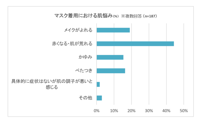 調査結果によると、マスク着用による肌悩みの内容で最も多かったのが「赤くなる・肌が荒れる」という回答。を超え、続いて、「メイクがよれる」が19.1%、「べたつき」が16.3%となっている。肌荒れの具体例としては、乾燥・かぶれ・吹き出物・ニキビ・ヒリヒリ感などが挙げられているようだ。