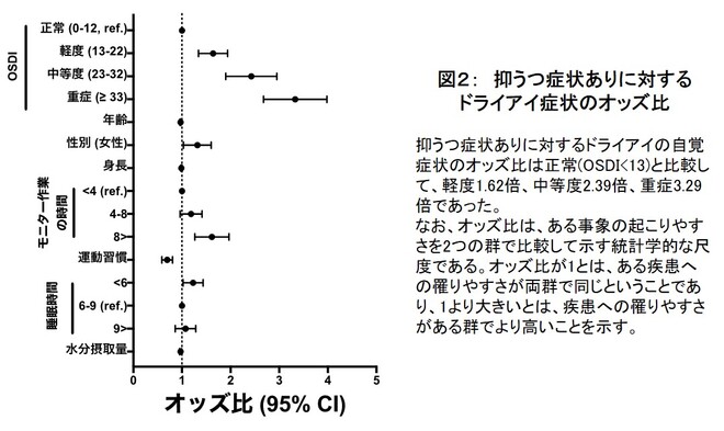 OSDIでは13点以上をドライアイ症状ありと定義、 SDSでは40点以上を抑うつ症状ありと定義し、対象者のドライアイの自覚症状と(1)~(3)などとの関連や、ドライアイの自覚症状と抑うつ症状の関連を解析した結果、4,454名の研究対象者のうち、74.0%(3,294名)にドライアイ症状を、73.4%(3,271名)に抑うつ症状を認めました。このうち、ドライアイ症状ありの中の抑うつ症状ありは78.8%(2596/3294名)でした。さらに、ドライアイの自覚症状が重症化するほど抑うつ症状も悪化傾向にあることがわかりました(図1)。また、重症のドライアイの自覚症状は正常と比較して3.29倍抑うつ症状を併発しやすいことがわかりました(図2)。