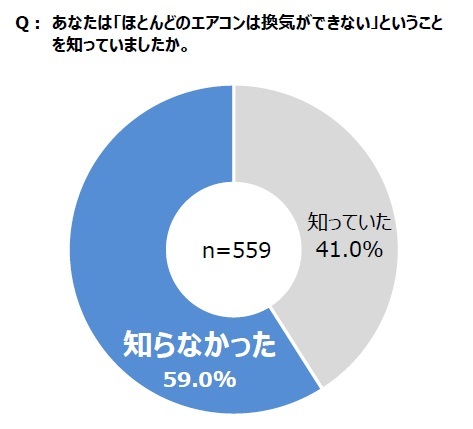 「緊急事態宣言の解除以降も家で換気をしていますか」という質問に対して88.8%の人が「換気している」と回答し、換気に対する意識の高さをうかがわせる結果となりました。その一方で「ほとんどのエアコンは換気ができないということを知っていましたか」という質問に対して、「知っていた」と回答したのは41.0%で、59.0%の人は「知らなかった」と回答しています。換気に関する行動と知識の間には少しギャップがあるといえそうです。