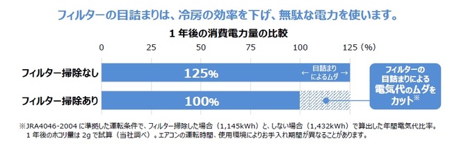 エアコンは部屋の暖かい空気を吸いこんで、冷たい空気にして吐き出すことで、部屋を涼しくしています。エアコン内部のフィルターが目詰まりすると、吸いこむ空気の量が少なくなり、部屋を冷やす力が小さくなるため、部屋を冷やすのに多くの電力が必要になります。1年間フィルター掃除をしないと、消費電力が約25%も増加します。