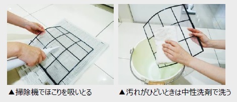 フィルターのほこりは、掃除機で丁寧に吸いとります。汚れがひどいときには、中性洗剤をとかしたぬるま湯で洗い、その後、日陰でよく乾かしましょう。