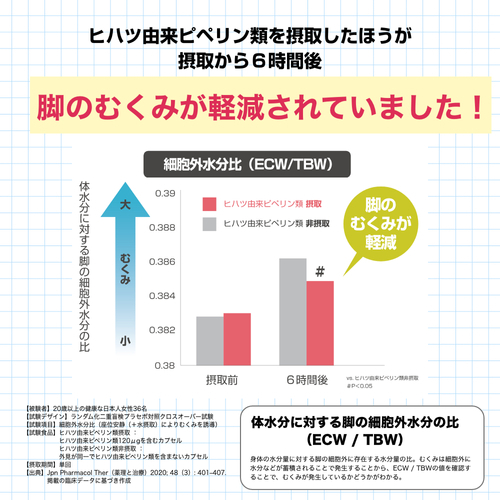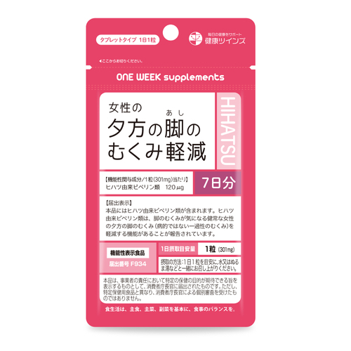 なお、本品には機能性成分であるヒハツ由来ピペリン類が含まれます。ヒハツ由来ピペリン類は、脚のむくみが気になる健常な女性の夕方の脚のむくみ(病的ではない一過性のむくみ)を軽減する機能があることが報告されています。