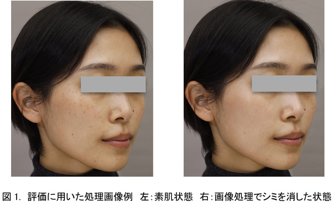 さらに資生堂では、お客さまの肌悩みが解消すると行動意識がどのように変化するか、その検証を行うために、シミを一例として実験を行いました。35-59歳の日本人女性のうち、シミを気にする方でファンデーションでも隠し切れないシミのある方32名を対象に、素肌の顔画像と、素肌からシミを消す画像処理を施した顔画像(図1)を見ていただき、すでに開発済の化粧の感情意識尺度と今回開発した4つの行動意識尺度の質問紙に回答いただきました。