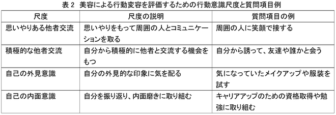 資生堂は、美容行為やその結果が、日々の行動意識( 自らの行動に影響をあたえうる、自身の意識のこと。)にどのような影響を及ぼすかを定量的に測定できる、行動意識尺度を新たに開発しました。その結果、行動変容の意識は下記の表2の記載の通り、4つの尺度で構成されること、またそれら尺度は16の質問項目によるアンケートで測定できることを見出しました。4つの尺度は、誰のための行動であるか(利他的または利己的)と、行動の種類(外見・外面的または内面・内省的)の2側面があると考えられました。