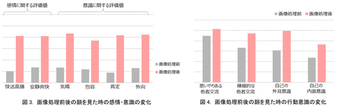その結果、シミのない画像を見ることで快活高揚等のポジティブな感情が有意に高まり、肯定・外向などの意識が有意に向上することを確認しました(図3)。さらに行動意識は4つの尺度全てが有意に向上することが確認できました(図4)。