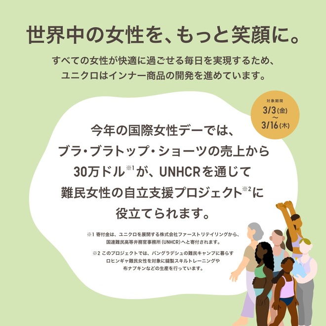 国際女性デーに女性支援のためのプロジェクトへの資金を拠出するのは、ファーストリテイリングとして初の取り組み。ユニクロ、ジーユーの商品のうち、ブラ、ブラトップ、ブラフィール、ショーツの売り上げから30万ドルを、国連難民高等弁務官事務所(UNHCR)を通して、バングラデシュの難民女性の自立支援プロジェクトへ寄付。