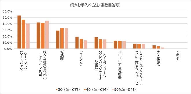 30・40代の次点は「様々な種類(用途)のスキンケア商品」、50代の次点は「シートマスク(シートパック)」、3位はどの年代も「W洗顔」でした。