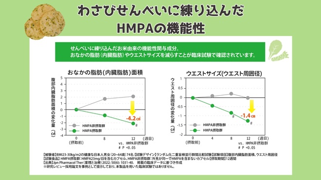HMPAが配合された「おなかの脂肪を減らす極旨わさびせんべい」は、上記の3つのヘルスクレームをもった米菓として日本で初めての機能性表示食品届出受理されています。