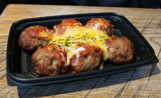 「成城石井自家製 3 種チーズの国産豚肉団子」(755円/税込)。ローズマリーやナツメグを効かせた肉団子の上から、トマトソース、レッドチェダーを使用したチーズソースをかけ、その上からレッドチェダー、モッツァレラ、ゴーダの 3 種類のチーズをトッピング。