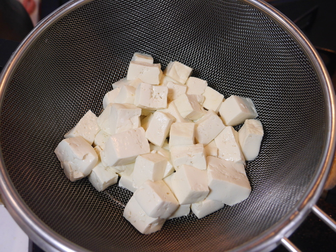 - 豆腐は食べやすい大きさに切り、熱湯でさっと茹で、ザルにあげておく。