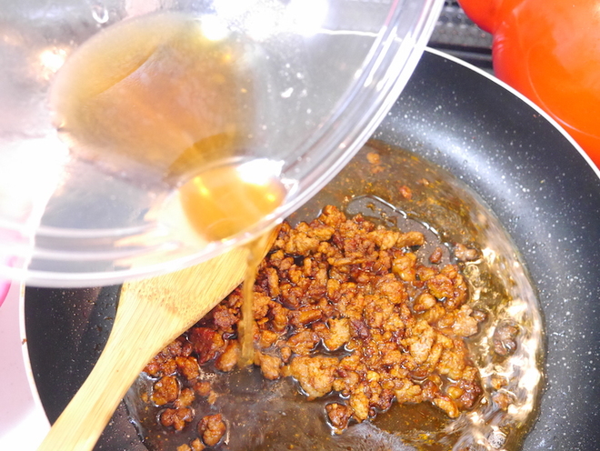 - 下準備Ⅲで用意した合わせ調味料を入れ、混ぜる。