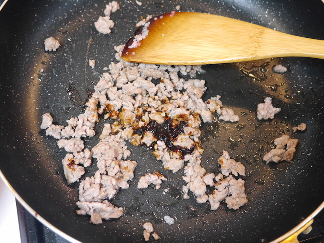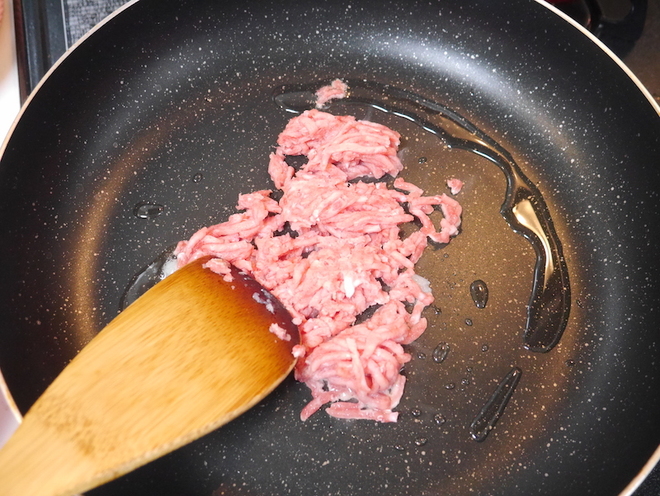 - にんにくの香りが立ってきたところで豚ひき肉を入れ、ほぐしながら炒める。