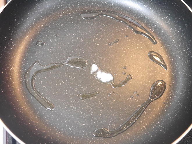 - フライパンで油を熱したところに、にんにく(チューブ)を入れる。