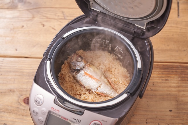 - 研いだお米に添付のタレを入れたら、タレと水で2合分の目盛りまで水を加え、のどぐろを乗せて炊きます