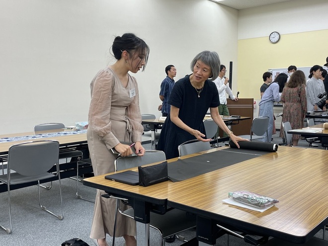 もともとは着物作家になりたかったという須藤さんは日本の布について「ただの素材だが布という作品としても評価してもらえるのが日本の布。機械と人の手両方が入る伝統的な作り方は今でも続いている」と語ります。この日は生地や帯で個性を出している日本人の美意識や、着物を長く大切に使う「もったいない」精神が根付く着物やその生地の魅力をワークショップで多角的に解説しました。