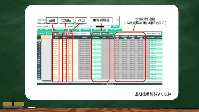 そこで、農研機構(国立研究開発法人農業・食品産業技術総合研究機構)が開発した 「生育予測技術」 により、データに基づいた収穫時期の予測 が可能になりました。気象データや生育モデルを活用し、収穫の最適なタイミングを教えてくれます。