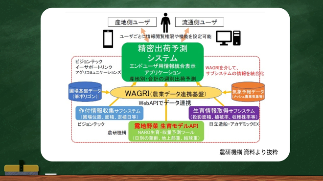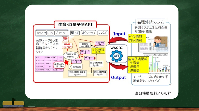 また、このシステムの予測精度を高めるため、WAGRI(農業データ連携基盤) の気象データを活用しています。WAGRIのデータは、全国を1km四方のメッシュに分け、過去の気象データに加えて26日先までの気象予報を提供するものです。これにより、露地栽培でもより正確な生育予測が可能 になります。