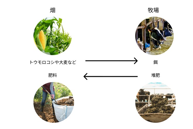 畑で育てられた作物の一部が牛のエサとなり、牛から出たふん尿は堆肥となって再び畑へ戻ります。
